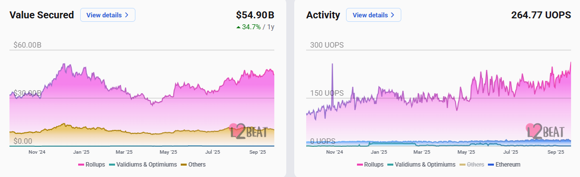 تواصل سلاسل L2 توسيع أنشطتها، محققةً نموًا في قيمتها بنسبة 35% خلال العام الماضي. واعتبارًا من سبتمبر، بلغت قيمة السلاسل 54.9 مليار دولار أمريكي، لتقترب من ذروتها التاريخية السابقة في أواخر عام 2024.