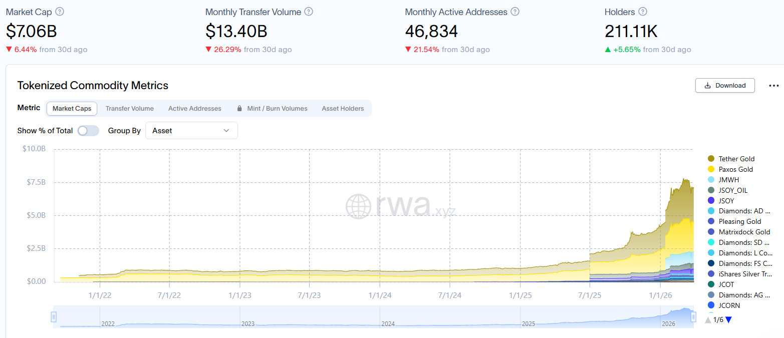 يشهد الطلب على السلع المُرمَّزة نموًا ملحوظًا، حيث ارتفعت القيمة السوقية الإجمالية لهذا القطاع إلى 7.7 مليار دولار في 6 مارس قبل أن تتراجع إلى نحو 7 مليارات دولار حتى يوم الاثنين، وفق بيانات RWA.xyz.