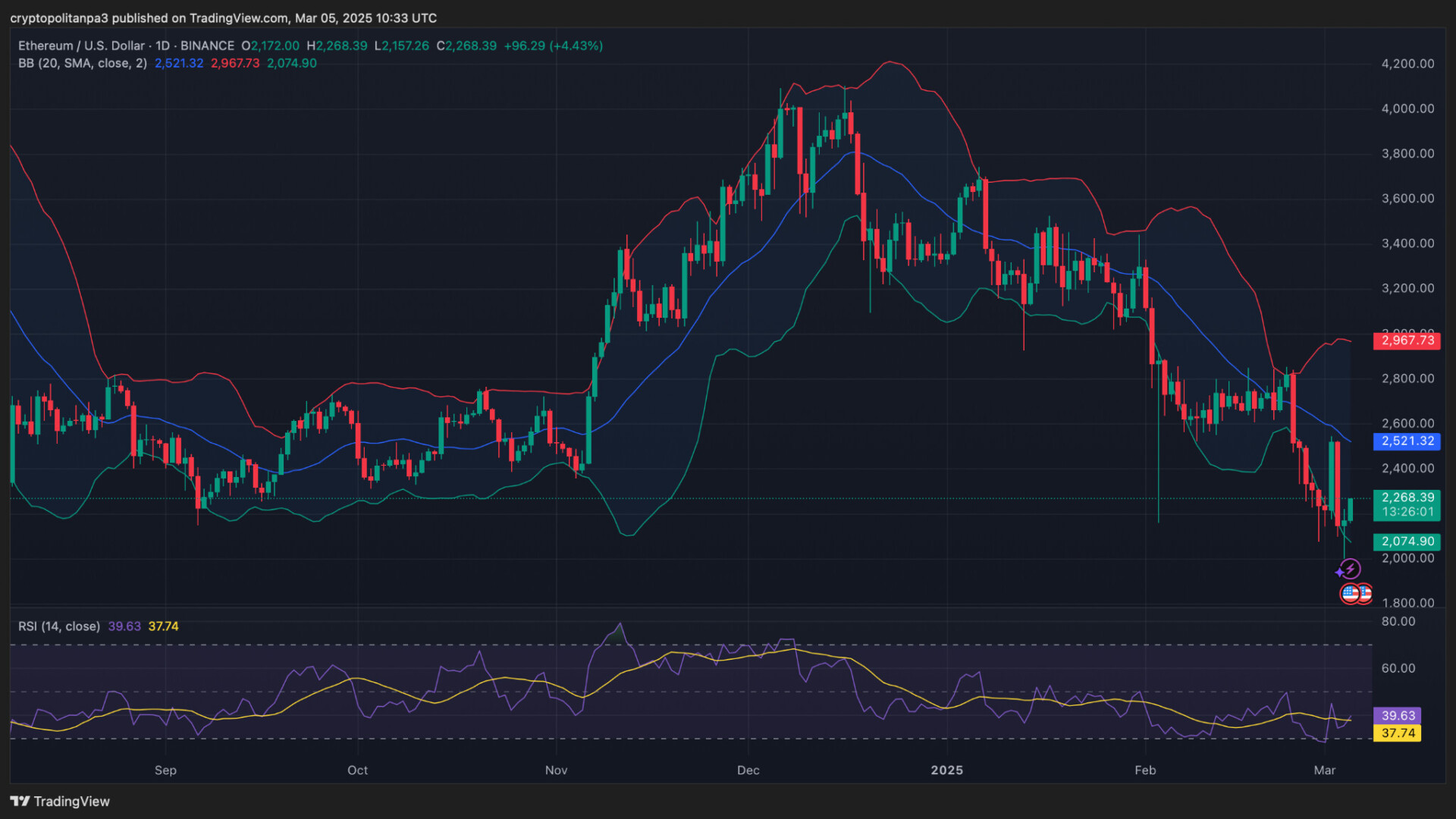 يُظهر الرسم البياني Ethereum (ETH/USD) لمدة يوم واحد في 5 مارس انتعاشًا ملحوظًا من أدنى مستوياته الأخيرة ، حيث حصل على +4.43 ٪ للتداول عند 2،268.39 دولار. تشير نطاقات Bollinger إلى زيادة التقلبات ، حيث يتم استرداد السعر نحو مقاومة النطاق المتوسط عند 2،521.32 دولار.