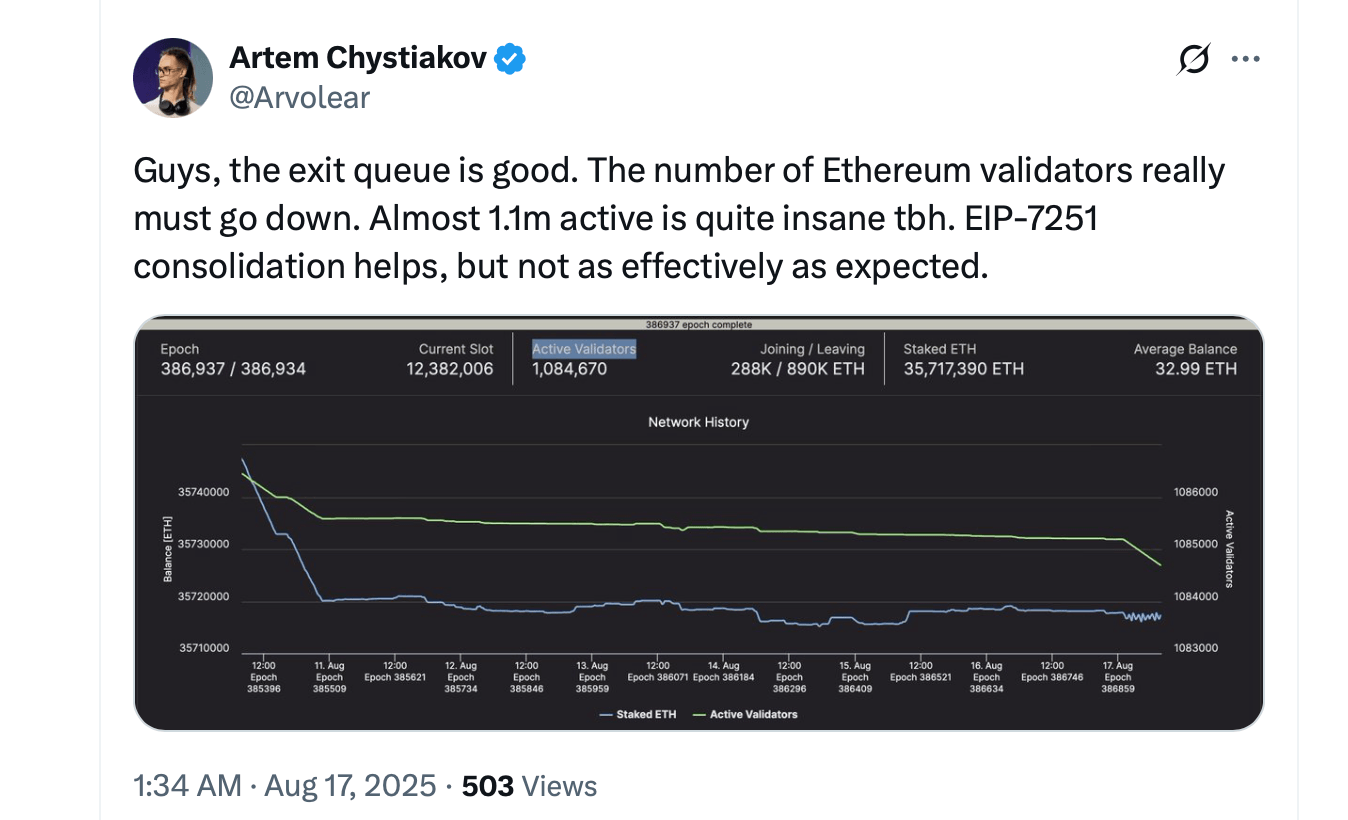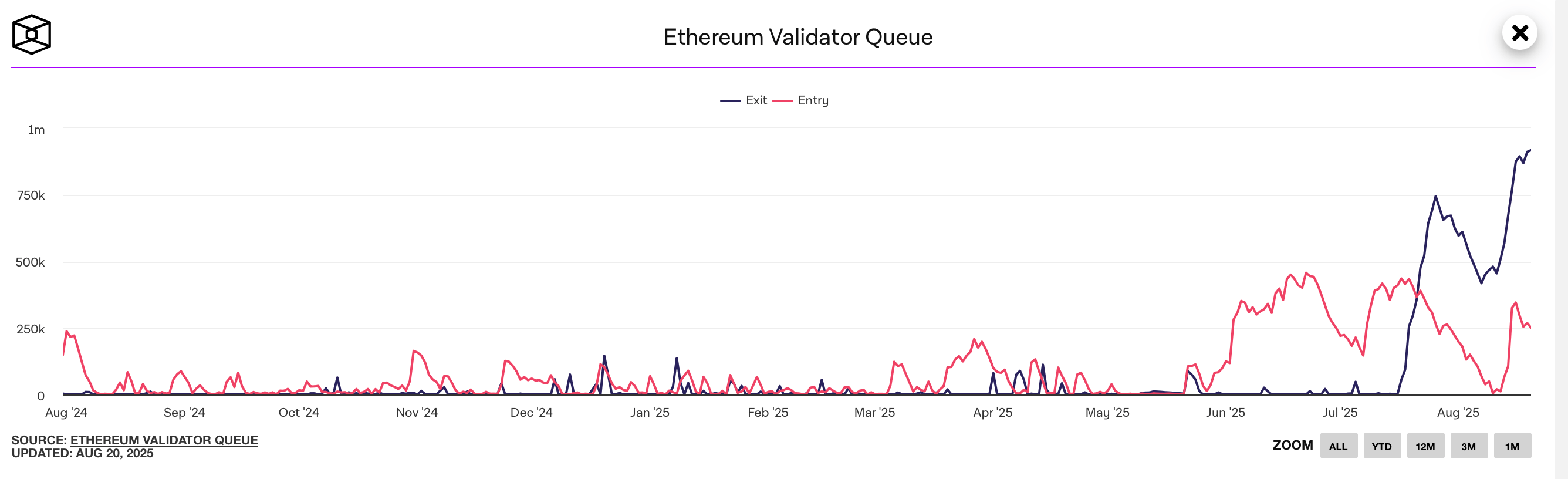 تضخم الطابور في الأسابيع الأخيرة: أواخر يوليو أظهرت حوالي 520,000 ETH في الانتظار، لتصل إلى حوالي 693,000 ETH بحلول 25 يوليو، حوالي 809,000 ETH بحلول 15 أغسطس، وبلغ ذروته حوالي 910,461 ETH في 18–19 أغسطس قبل أن يتحوم حول أرقام قياسية تفوق 916,000 في 20 أغسطس. الموضوع أيضًا موضوع ساخن على قنوات وسائل التواصل الاجتماعي مثل X.