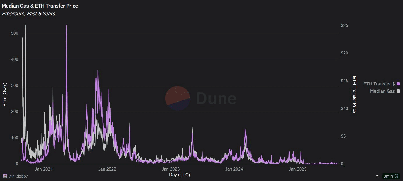 ما أهمية هذا؟ في دورات إثيريوم السابقة، غالبا ما كانت تتعثر الارتفاعات عند ارتفاع أسعار الغاز. في عام 2021، تجاوز سعر إثيريوم حوالي ٤.٨ ألف دولار أمريكي، بالتزامن مع ارتفاع متوسط تكاليف الغاز والنقل، مما يدل على أن الشبكة بلغت حدودها القصوى.