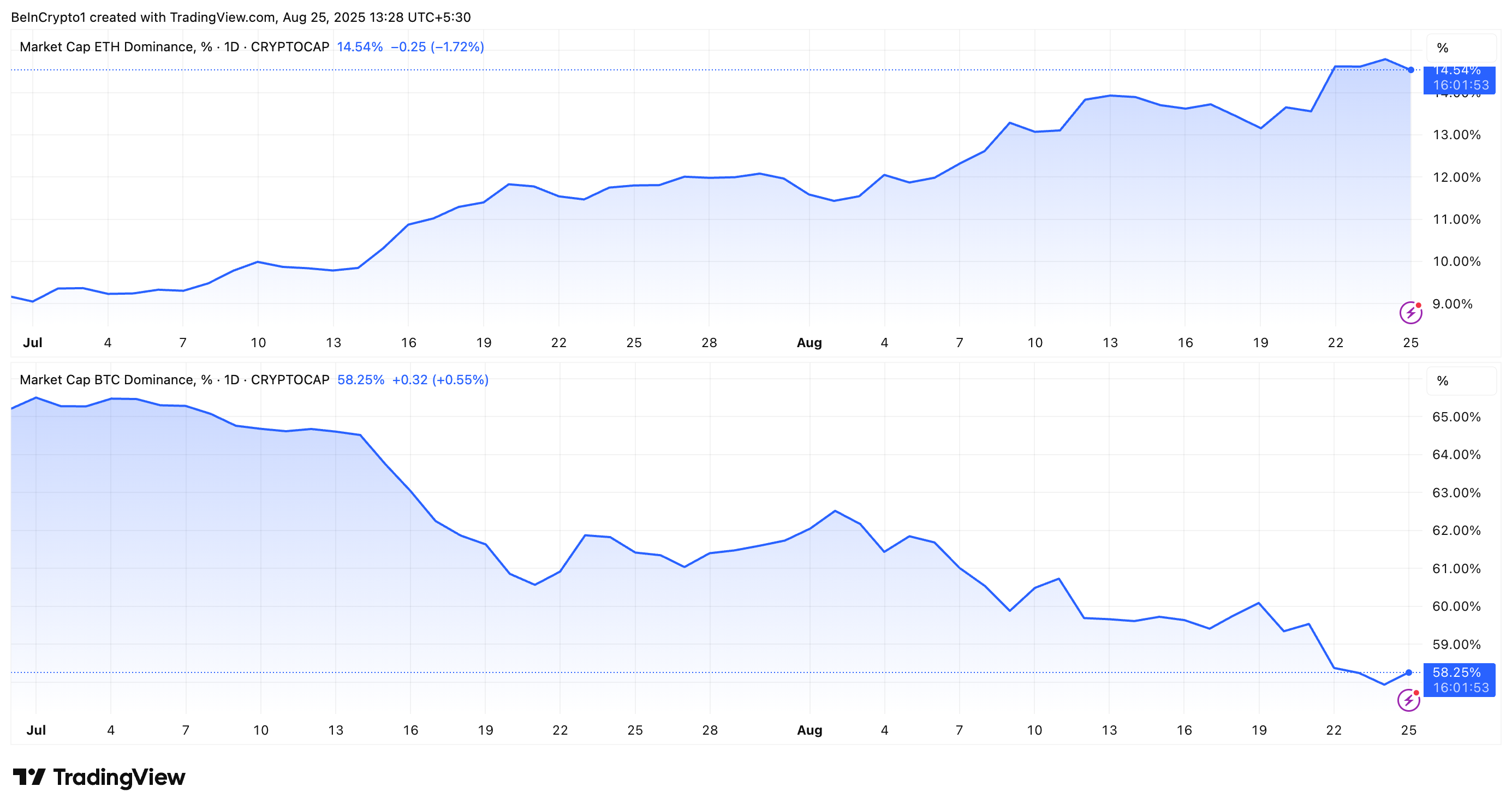 في وقت كتابة هذا التقرير، كانت قد تعدلت إلى ١٤,٥٤٪. كما في الوقت نفسه، تم تسجيل BTC.D عند ٥٨,٢٪، وهو أدنى مستوى لها منذ يناير ٢٠٢٥.