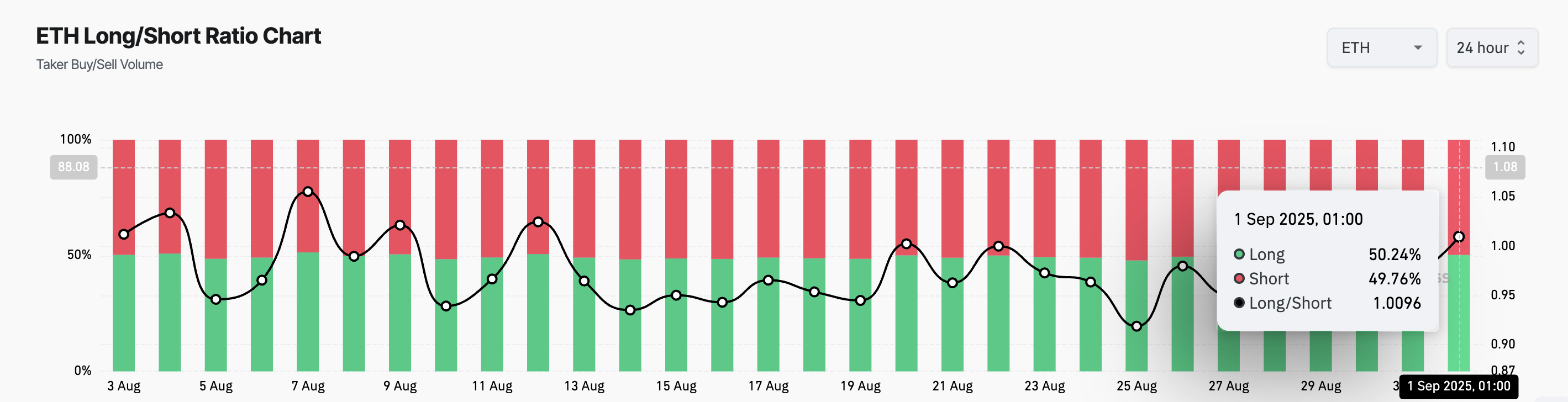 تسليط الضوء على ارتفاع نسبة ETH على الميل المتزايد نحو التفاؤل بين المشاركين في السوق. يشير هذا إلى أن المتداولين يزدادون ثقة في قدرة العملة على الحفاظ على اتجاه صعودي خلال الأسابيع القادمة.