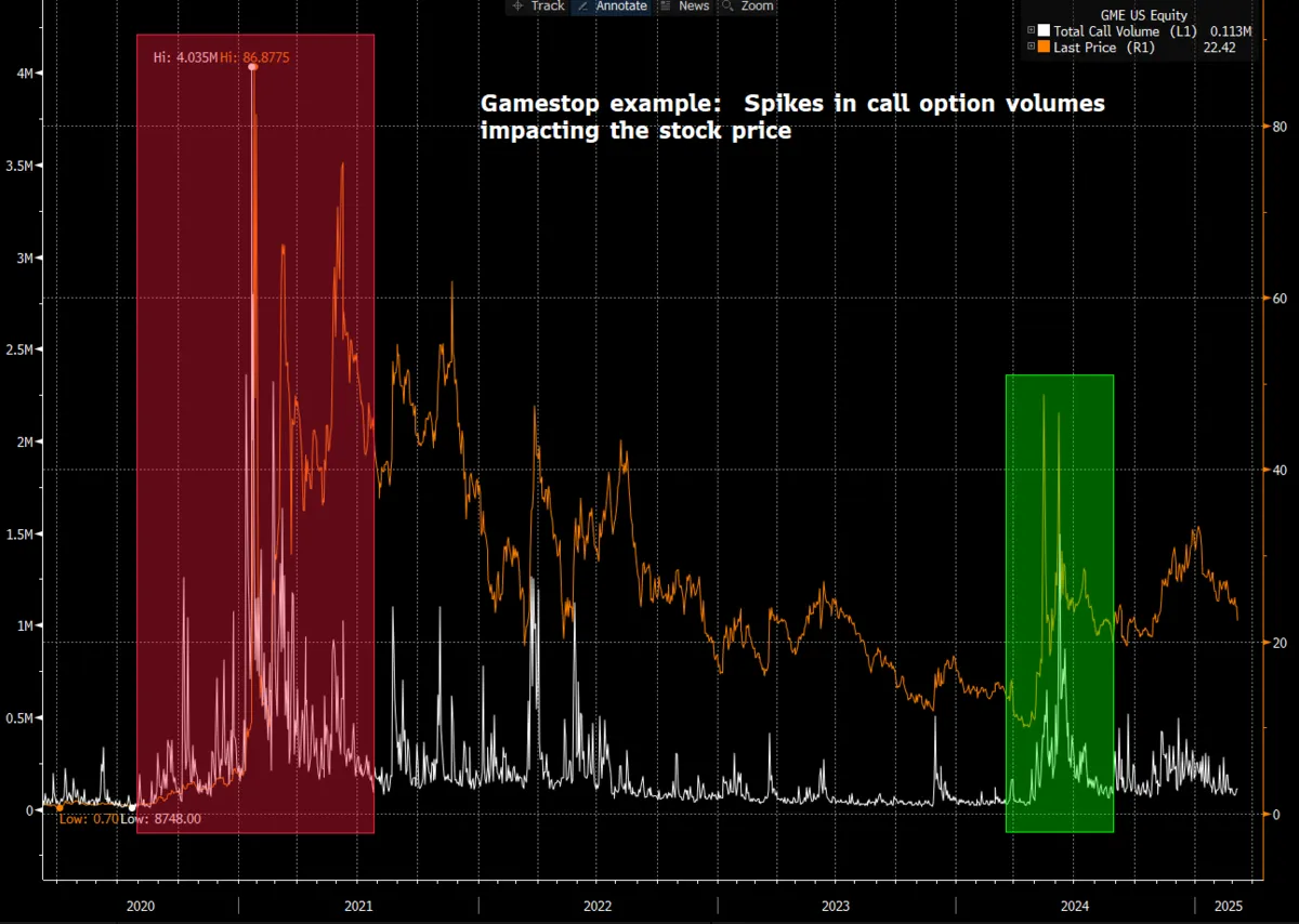 لا يتم الشعور بالأثر الأكبر في تداول المشتقات في الفهارس - إنه يضرب الأسهم الفردية. تسلا و NVIDIA و Apple ، جميع اللاعبين الرئيسيين في تداول الخيارات ، انخفضت بشكل أسرع من السوق الأوسع. هذا ليس جديدًا. أظهر الضغط القصيرة في GameStop في عام 2021 كيف يمكن أن يؤدي تداول الخيارات إلى تقلبات الأسعار البرية.