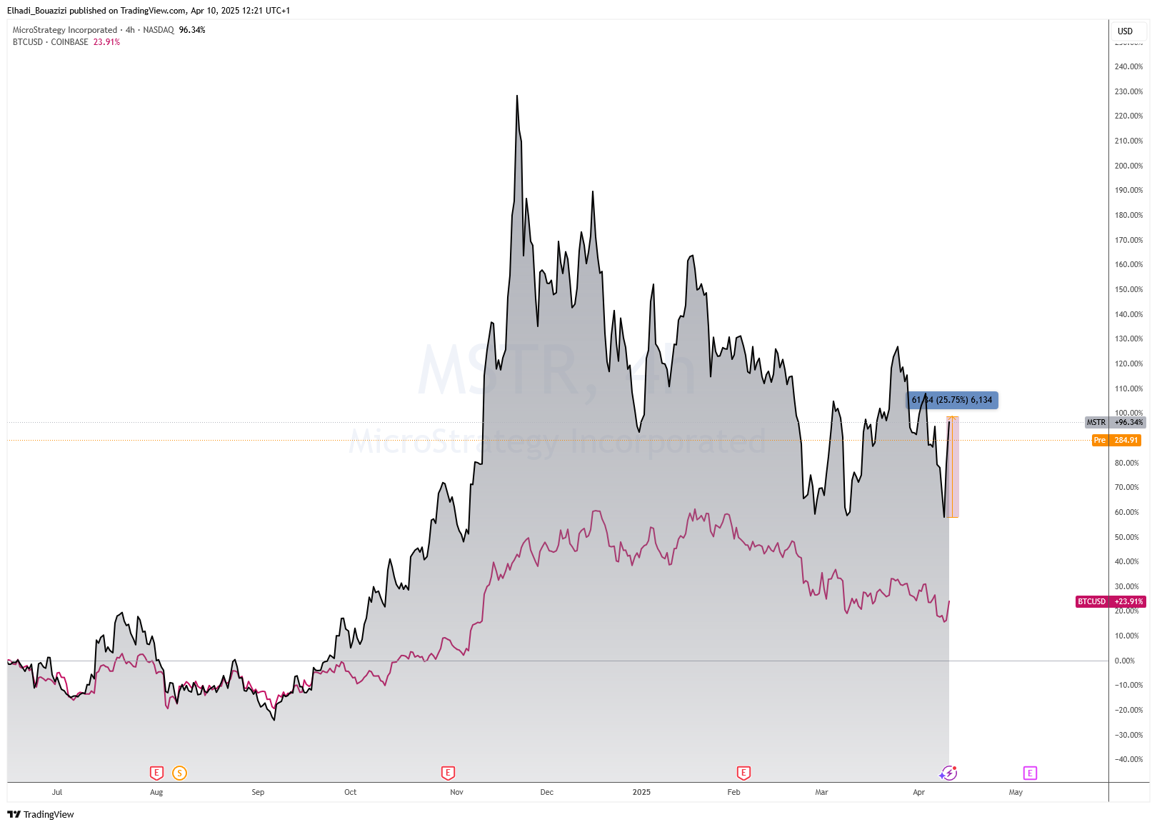 شهد سهم شركة مايكروستراتيجي المدرجة تحت رمز MSTR ارتفاعًا لافتًا بنسبة 25% خلال تعاملات اليوم، متجاوزًا التوقعات رغم الأجواء المتوترة في الأسواق المالية بسبب تصريحات الرئيس الأمريكي السابق دونالد ترامب بشأن الرسوم الجمركية المتبادلة. فكيف يمكن تفسير هذا الأداء القوي وسط هذه العاصفة السياسية والاقتصادية؟