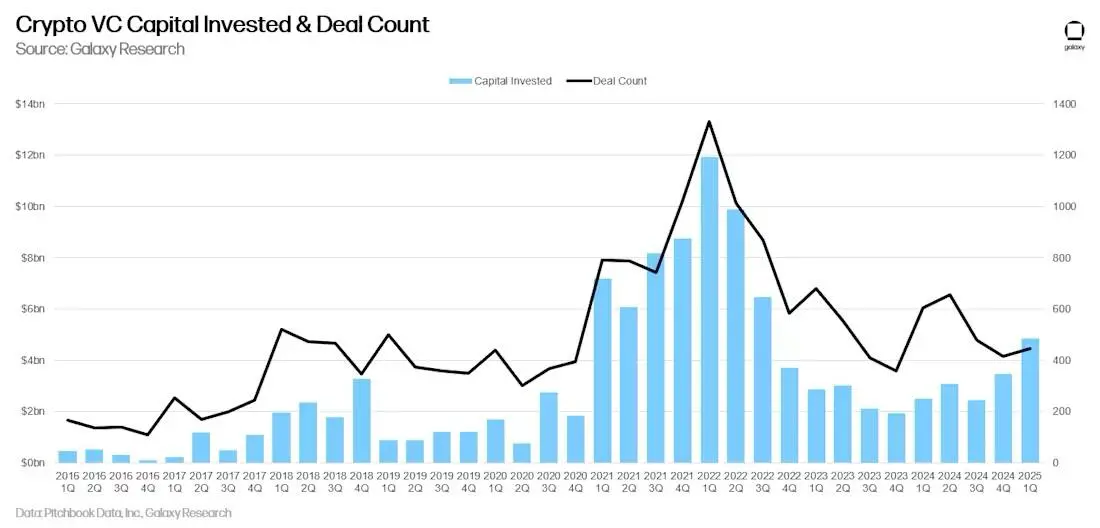 استثمرت شركات Venture Capital (VC) 4.8 مليار دولار من الشركات الناشئة في الربع الأول من عام 2025 ، مما يشير إلى عودة الصفقات المتعلقة بالتشفير. أبلغت شركة الأصول الرقمية ، Galaxy ، عن ذلك في ملخص صفقة ، مشيرة إلى أن هذا يمثل زيادة بنسبة 40 ٪ مقارنة بـ Q4 لعام 2024.