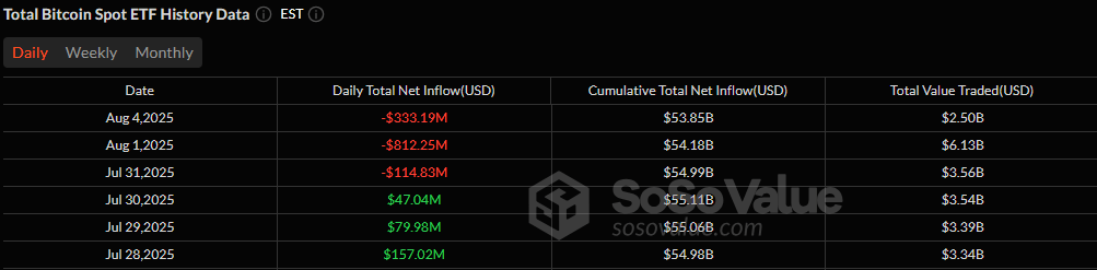 قام المستثمرون بالفرملة على صناديق المؤشرات المتداولة للعملات الرقمية يوم الاثنين، 4 أغسطس، مما أدى إلى واحدة من أسوأ عمليات البيع في الصيف. صناديق بيتكوين فقدت 333.19 مليون دولار، بينما سجلت صناديق إيثر خروجًا قياسيًا بقيمة 465.06 مليون دولار، وهو أكبر خروج يومي لها منذ إنشائها. يعكس السحب الإجمالي البالغ 798 مليون دولار حذرًا متجددًا في أسواق الأصول الرقمية.