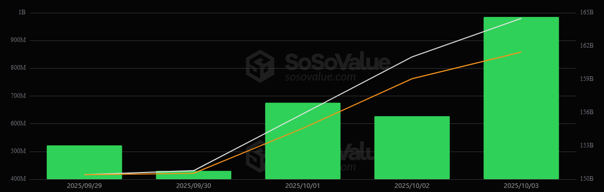 صناديق التداول في البورصة للعملات الرقمية (ETFs) بدأت شهر أكتوبر بزخم لا يوقف. لقد جمعت صناديق البيتكوين المتداولة في البورصة تدفقات دخل بقيمة 3.24 مليار دولار، في حين أضافت صناديق الإيثريوم المتداولة في البورصة 1.3 مليار دولار، مما يمثل واحدة من أقوى الأسابيع منذ الانطلاق ويشير إلى شهية مؤسساتية عميقة.