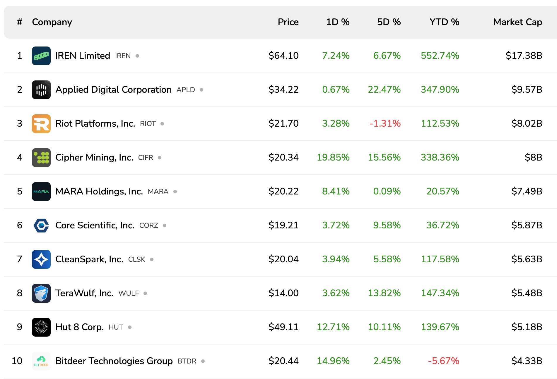 أسهم تعدين البيتكوين كانت من بين الأداءات البارزة لليوم، حيث شهد المُعدّنون ذوي القيمة السوقية الكبيرة والمتوسطة ارتفاعات قوية في يوم واحد. قادت شركة IREN Limited (IREN) القطاع، حيث ارتفعت بنسبة 7.24% لتغلق عند $64.10، مدعومةً بقيمة سوقية تبلغ $17.38 مليار.