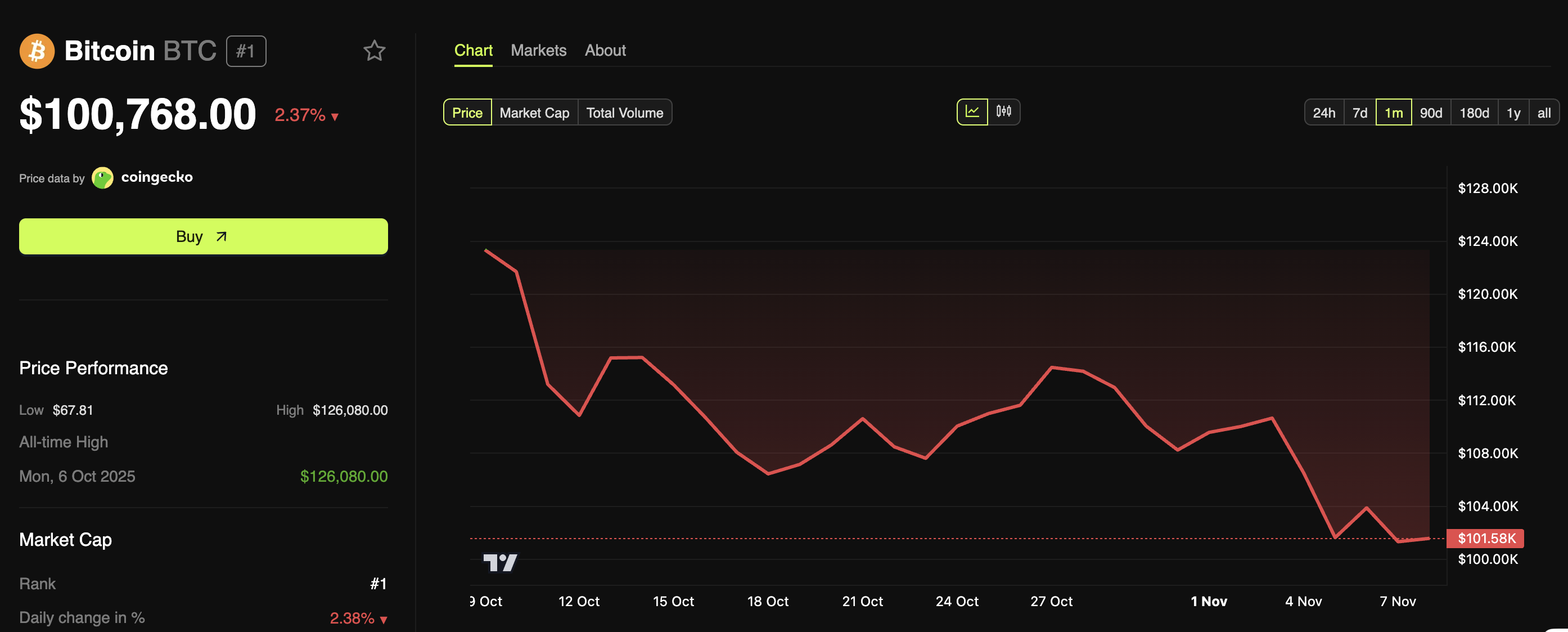 لم يسهم تدفق رأس المال كثيرًا في دعم السعر. أظهرت بيانات BeInCrypto Markets أن بيتكوين انخفضت بنسبة ٢,٣٧% خلال اليوم الماضي، ممتدة تراجعها الأسبوعي بنسبة ٩%. في وقت كتابة هذا التقرير، تداولت العملة الرقمية الأكبر بحوالي ١٠٠,٧٦٨ دولار.