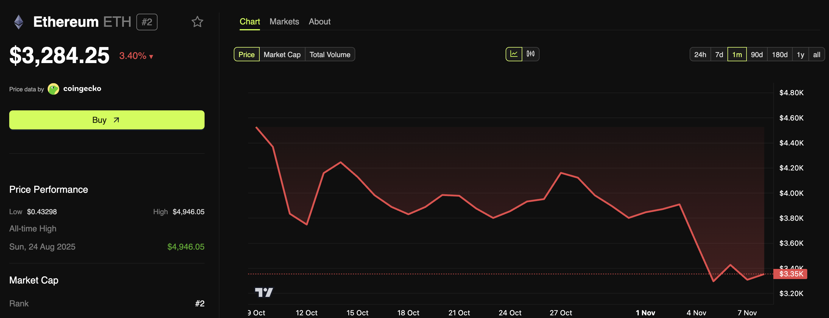 وفي الوقت نفسه، كانت إيثريوم أيضًا تنخفض. خلال الأسبوع الماضي، انخفضت قيمة ETH بحوالي 15%. في وقت النشر، بلغ سعر تداول العملة البديلة $3٬284، بانخفاض 3٬40% خلال اليوم الماضي.
