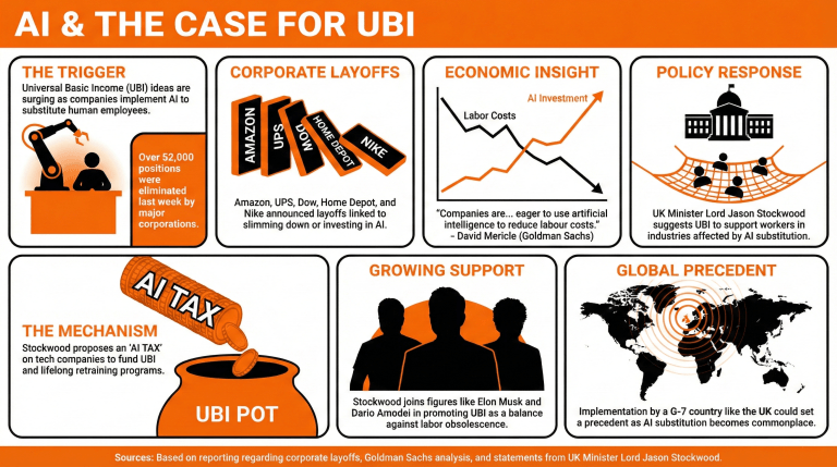 أفكار الدخل الأساسي العالمي يتم النظر فيها الآن بعدما أصبحت عمليات تسريح العمال المرتبطة بالذكاء الاصطناعي أكثر تكرارًا عبر الصناعات التقنية العالية. في الأسبوع الماضي، أعلنت الشركات عن تقليص عدد موظفيها بمقدار 52,000، وكثير منهم بسبب تطبيقات الذكاء الاصطناعي التي خفضت تكاليف العمالة في الولايات المتحدة.