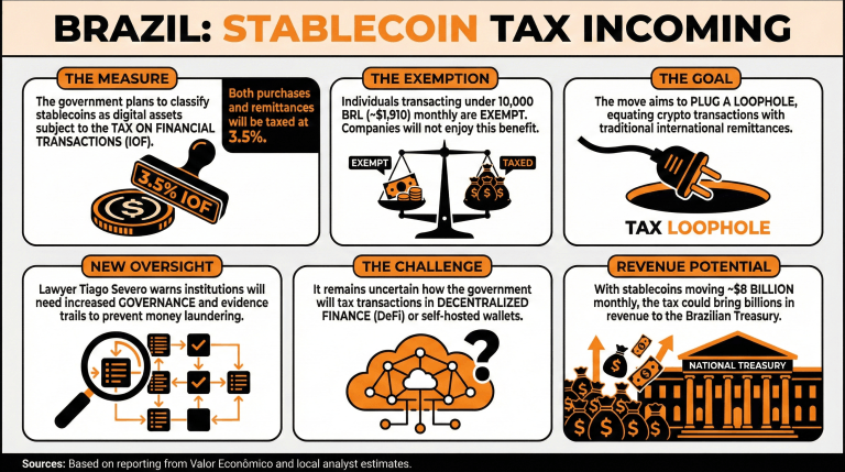 تخطط الحكومة البرازيلية لتصنيف العملات المستقرة كأصول رقمية، مما يجعلها خاضعة لضريبة المعاملات المالية بنسبة 3.5٪ (IOF). -
