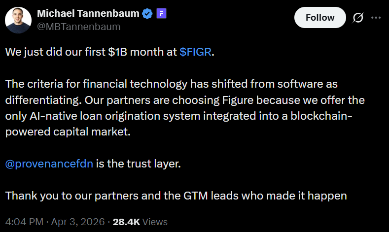 وتُعد Figure Technology شركة تكنولوجيا مالية تستخدم البلوكشين لإصدار وإدارة القروض الاستهلاكية، بما في ذلك منتجات التمويل بضمان حقوق ملكية المنازل. وكشف الرئيس التنفيذي Michael Tannenbaum مؤخرًا أن الشركة عالجت لأول مرة حجم معاملات شهري تجاوز مليار دولار.