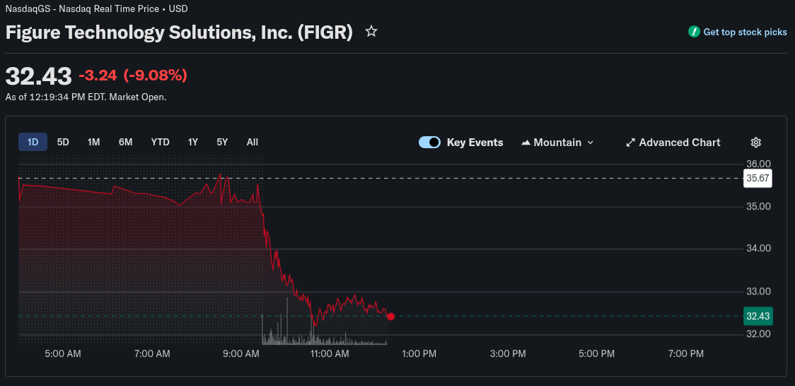 وانخفض سهم FIGR بأكثر من 9% في تداولات صباح الخميس، ليتراجع إلى نطاق 32 دولارًا بعد أن اقترب من 37 دولارًا في وقت سابق من الأسبوع. وكانت المكاسب السابقة مدفوعة بزخم الأسهم المرتبطة بالعملات المشفرة وتزايد اهتمام المستثمرين بالشركات المرتبطة بالإقراض القائم على البلوكشين.