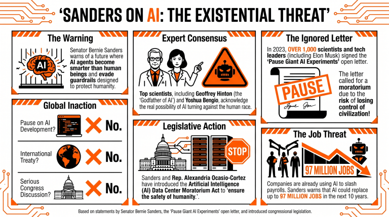 - بيرني ساندرز يحذر من أن البشرية قد تفقد السيطرة على الذكاء الاصطناعي، مما يؤدي إلى عواقب وخيمة.