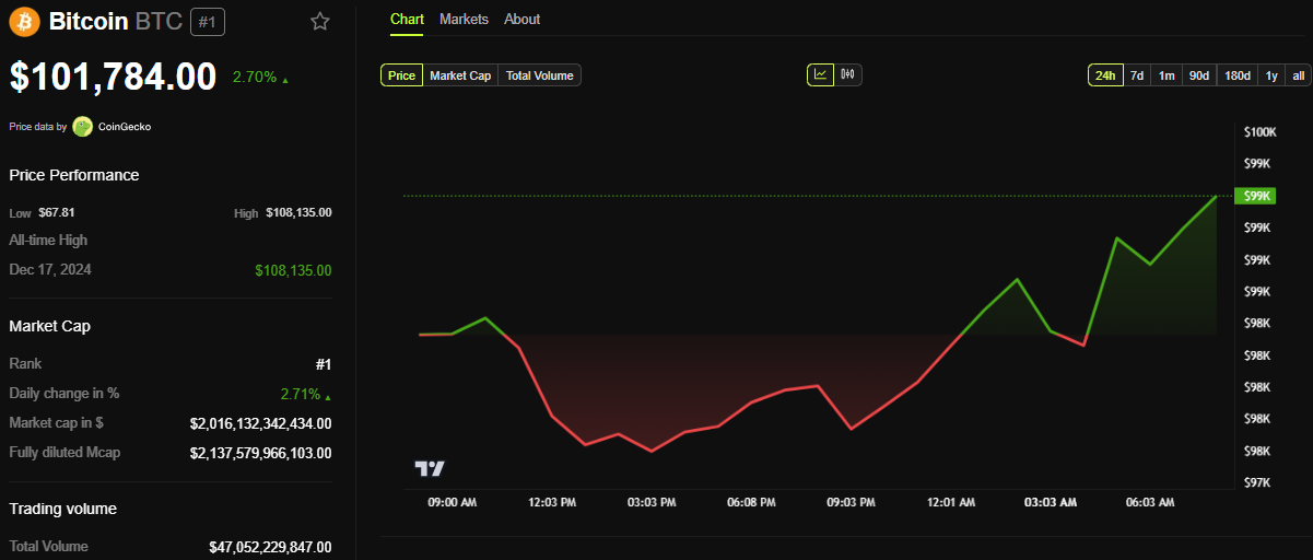 تُظهر بيانات BeInCrypto أن BTC كان يتداول عند 101,784 دولار في وقت كتابة هذا التقرير. يمثل هذا ارتفاعًا متواضعًا يقارب 3% منذ افتتاح جلسة الثلاثاء.
