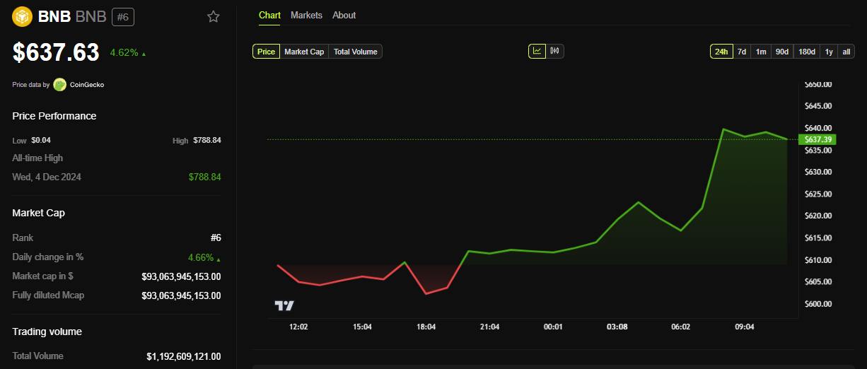 تظهر بيانات BeInCrypto أن سعر بينانس كوين قفز تقريبًا 5% على خلفية هذا الخبر. في وقت كتابة هذا التقرير، كان BNB يتداول بسعر $637,63، بزيادة 4,62% منذ افتتاح جلسة الثلاثاء.