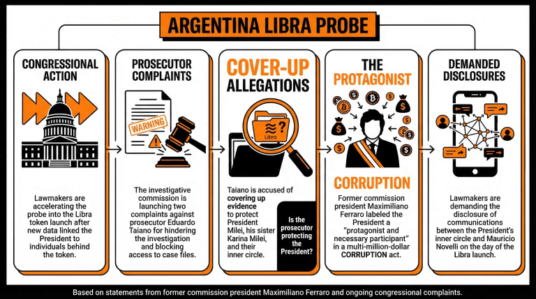 - لماذا يسرع المشرعون الأرجنتينيون التحقيق في عملة ليبرا المشفرة؟ إنهم يتخذون إجراءات بعد ظهور بيانات جديدة ربطت الرئيس ميلي ودائرته المقربة بإطلاق العملة الرقمية.