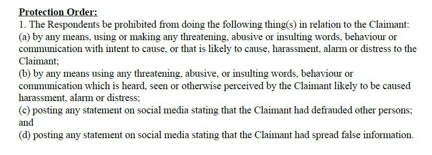ويقضي أمر المحكمة بحظر أي تواصل يتضمن تهديداً أو إساءة أو إهانة، كما يلزم الطرفين بدفع إجمالي 2,500 دولار سنغافوري (نحو 1,900 دولار) كتعويضات وتكاليف قبل 7 أبريل.