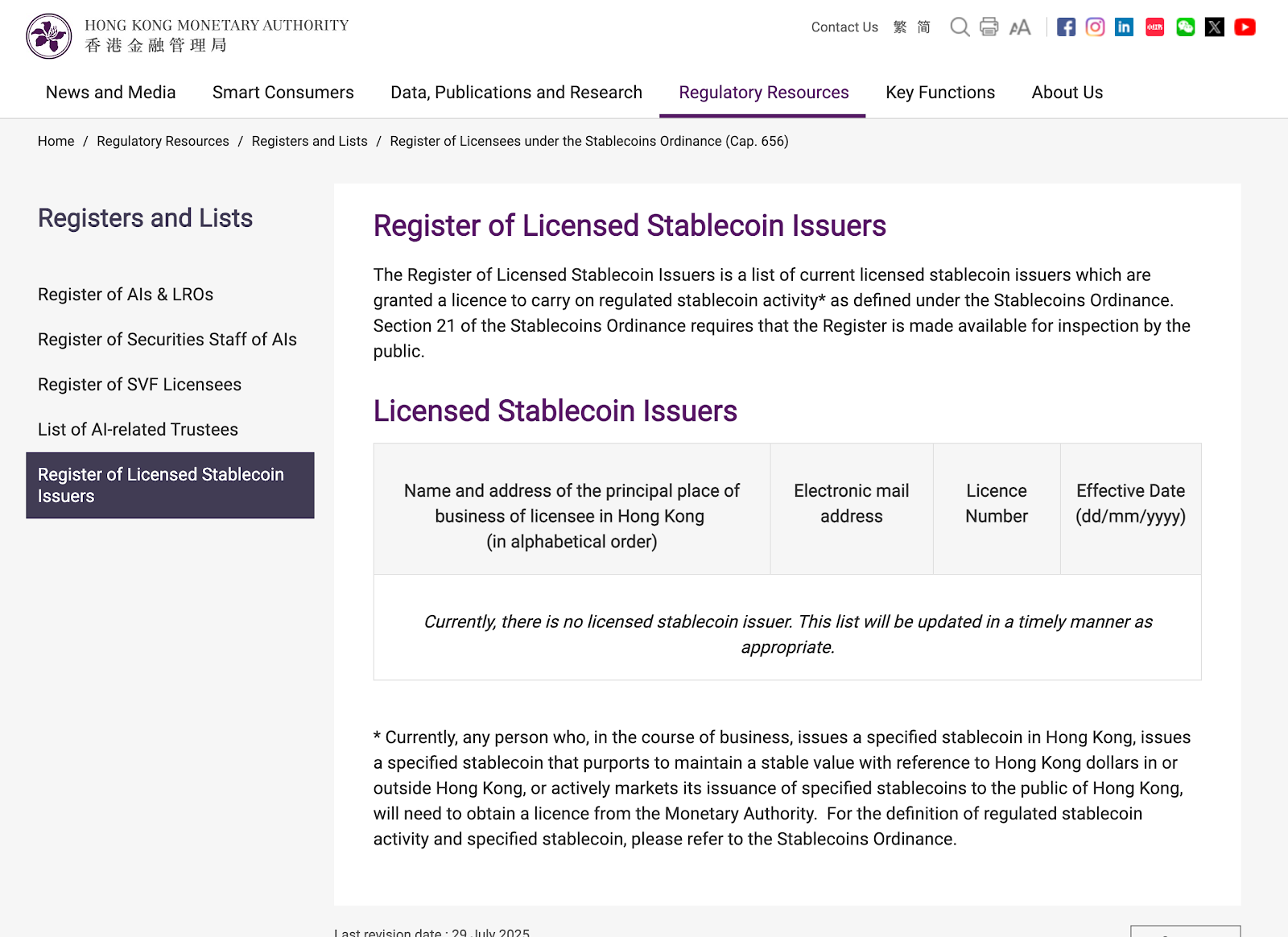 وقال متحدث باسم HKMA لـ Cointelegraph إن الهيئة “تمضي قدماً بنشاط في مسألة الترخيص وستعلن مزيداً من التفاصيل في الوقت المناسب”، من دون تقديم موعد محدّث. وحتى وقت النشر، لم يظهر السجل العام للهيئة أي جهات مرخّصة لإصدار العملات المستقرة.