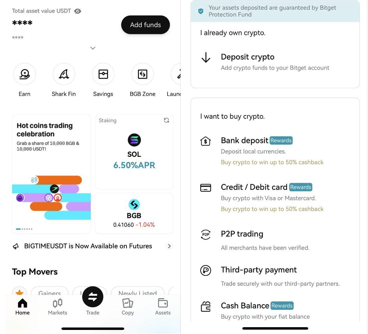 - توفر Bitget خيارات تداول متعددة، بما في ذلك التداول الفوري، والعقود الآجلة، والتداول بالنسخ، مما يلبي احتياجات مختلف المتداولين.