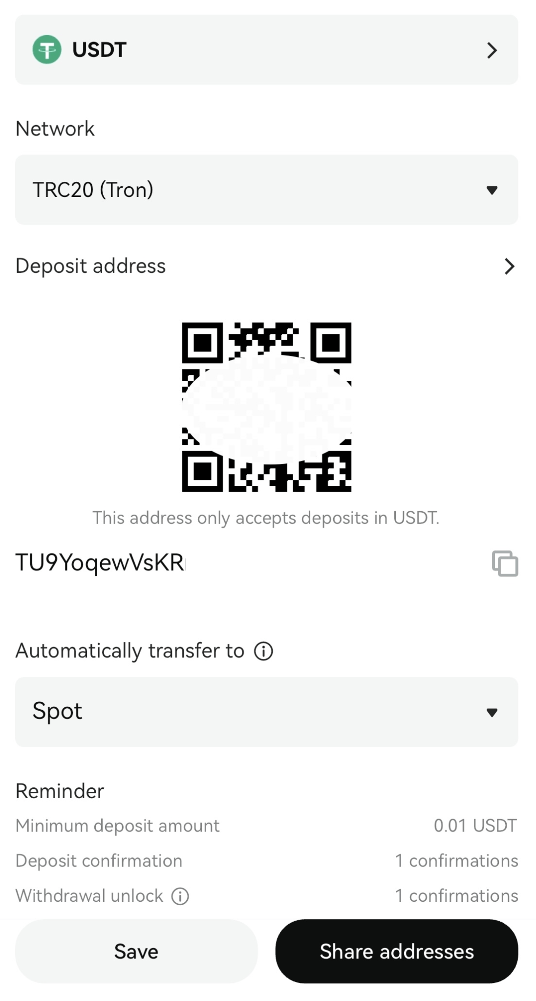 بعد تحديد الرمز المميز والسلسلة المفضلة لديك، ستقوم Bitget بإنشاء عنوان إيداع فريد ورمز QR لك. يمكنك استخدام العنوان أو مسح رمز الاستجابة السريعة QR ضوئيًا باستخدام محفظتك الخارجية لإعداد عملية النقل.