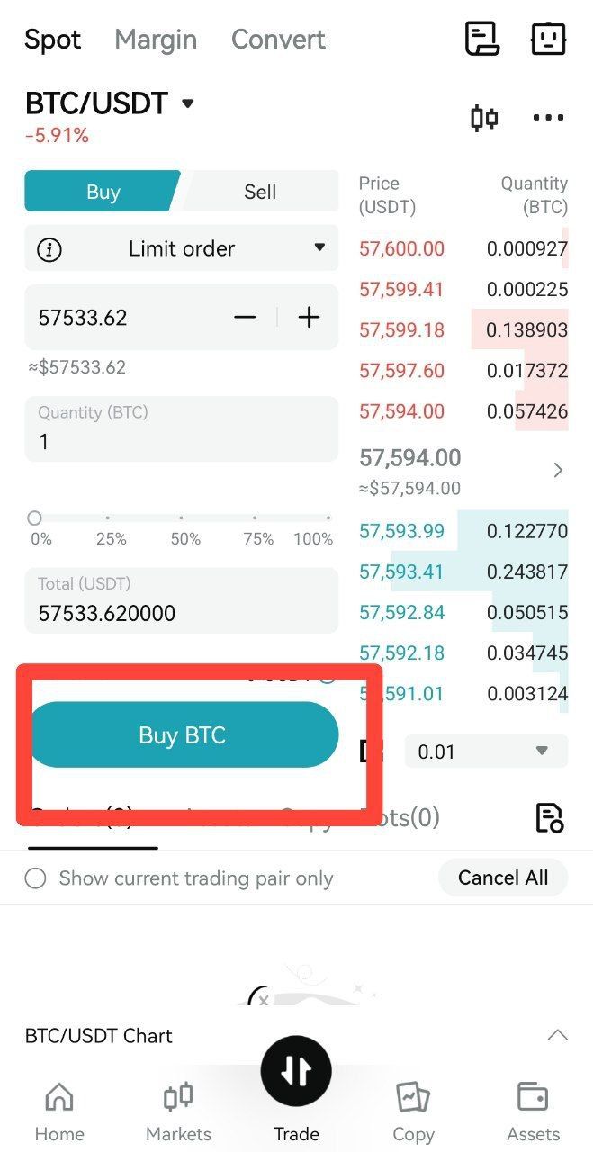 - حدد نوع الطلب الذي تريد تقديمه. بعد إعداد تفاصيل طلبك، انقر فوق “شراء” إذا كنت ترغب في شراء العملة المشفرة، أو “بيع” إذا كنت تنوي بيعها.