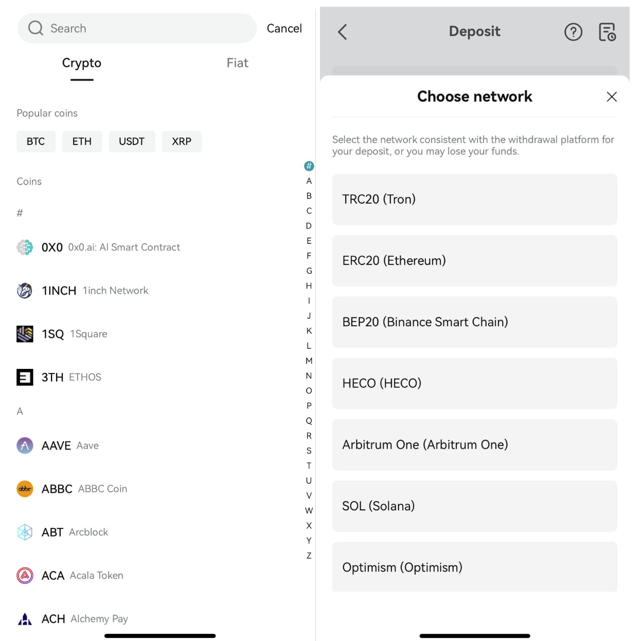 ضمن علامة التبويب “التشفير”، سترى قائمة بالعملات المشفرة التي يمكنك إيداعها في حسابك. اختر نوع العملة التي ترغب في إيداعها.