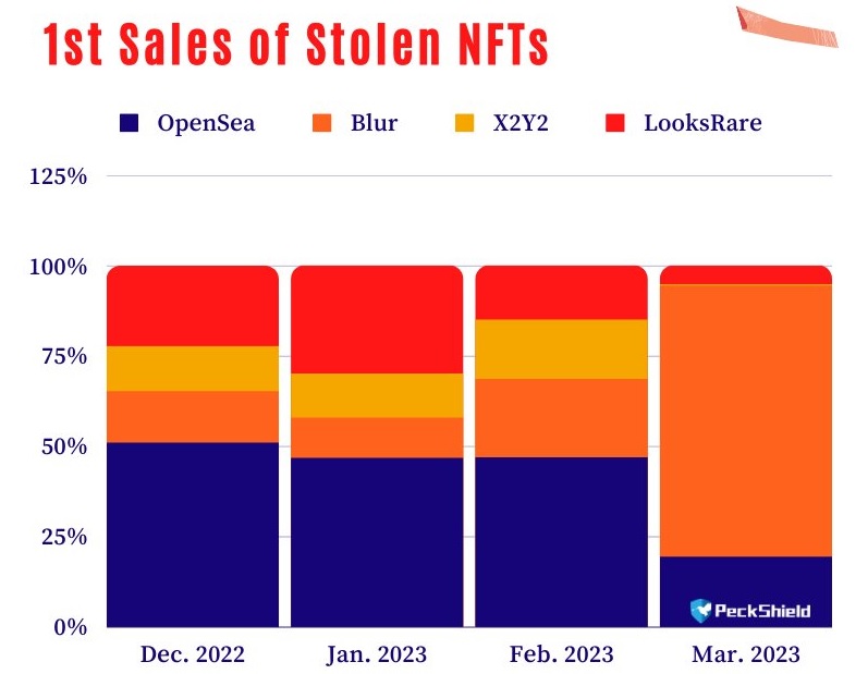 بحسب منصة PeckShield فقد تم بيع ما يقترب من 74.9% من الرموز المسروقة على سوق Blur و19.5% على سوق OpenSea.