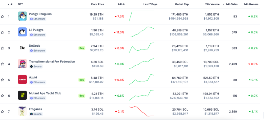 بالنظر إلى الحجم على مدار 24 ساعة، يمكننا أيضًا أن نرى أن "Lil Pudgy" هي المجموعة الأكثر تداولًا مؤخرًا. ثم تليها DeGods وPudgy Penguins. ومن الجدير بالذكر أن المجموعات موجودة الآن داخل "Pudgy World"، وهو عالم رقمي تفاعلي، دخلت السوق الخارجية، وهي تقدم ألعابًا جسدية في بعض متاجر Walmart.