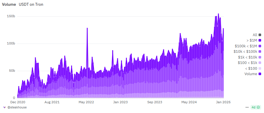 تحمل TRON حصة كبيرة من المعاملات المهنية ومعاملات الحيتان، مع جزء كبير من حجم المعاملات التي تزيد عن 100 ألف دولار والملايين.