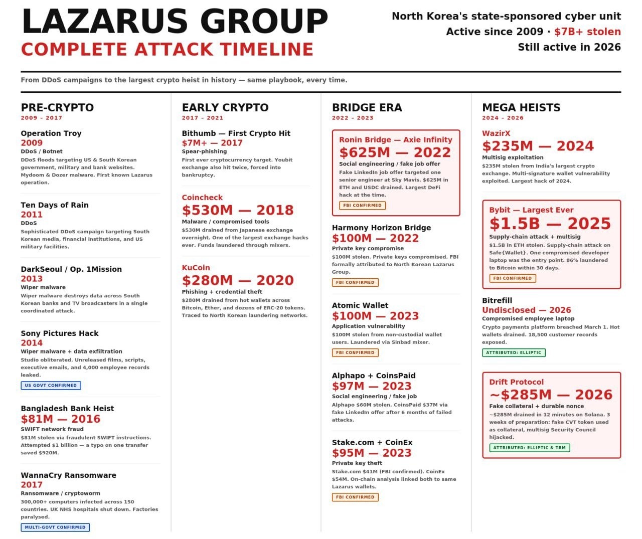 وقد ارتبطت هذه المجموعة بعدد من أكبر عمليات الاختراق في القطاع، منها اختراق Ronin Bridge بقيمة 625 مليون دولار في 2022، واختراق WazirX بقيمة 235 مليون دولار في 2024، وسرقة Bybit بقيمة 1.4 مليار دولار في 2025.