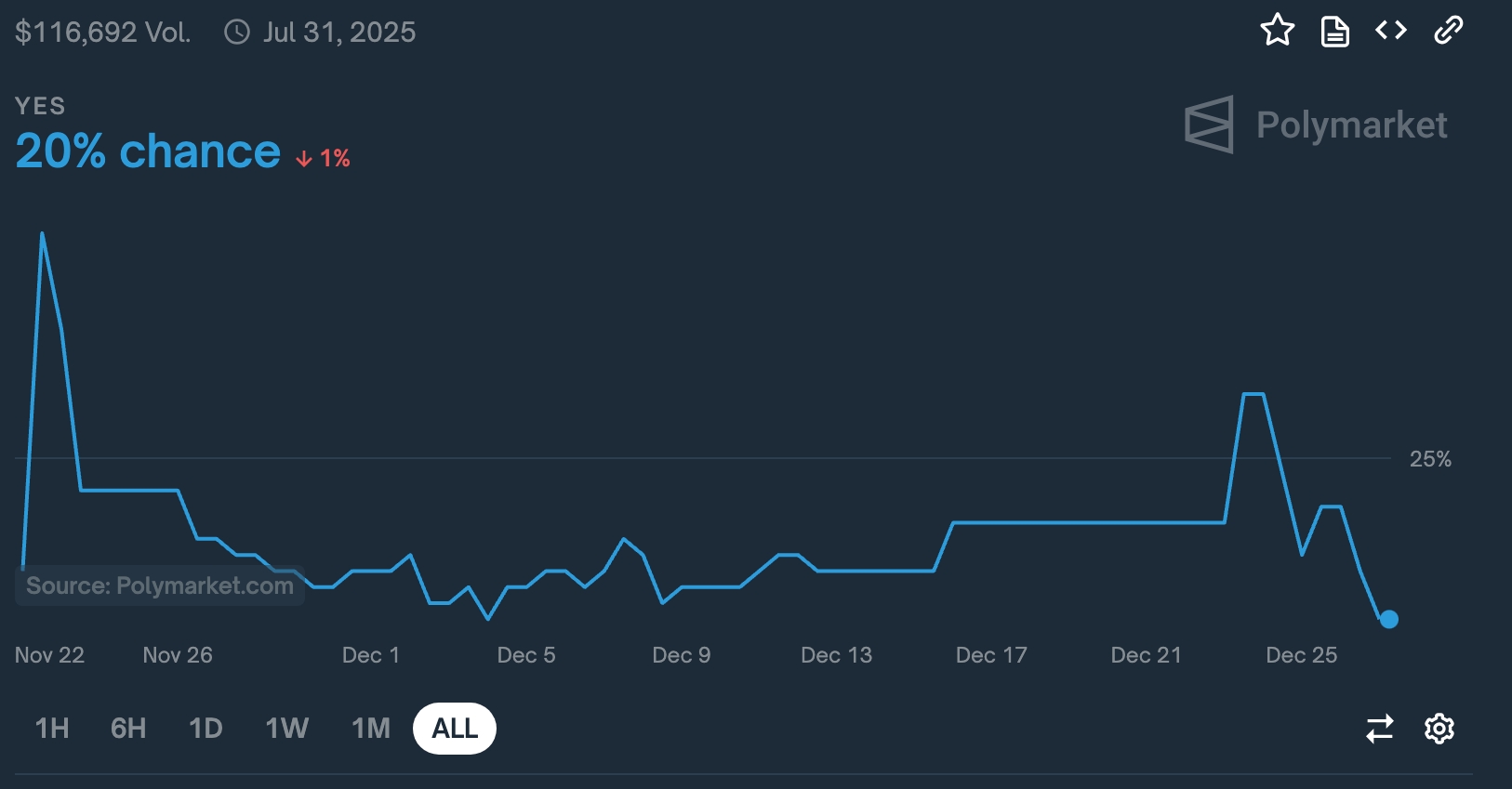 Ein weiterer Grund ist der drastische Rückgang der Chancen auf eine DOGE-ETF-Zulassung durch die US-amerikanische Börsenaufsichtsbehörde Securities and Exchange Commission (SEC) basierend auf Polymarket-Wetten. Die Chance auf dieses Ereignis liegt laut der dezentralen Online-Wettplattform nun bei 20 % – im November waren es noch 32 %.