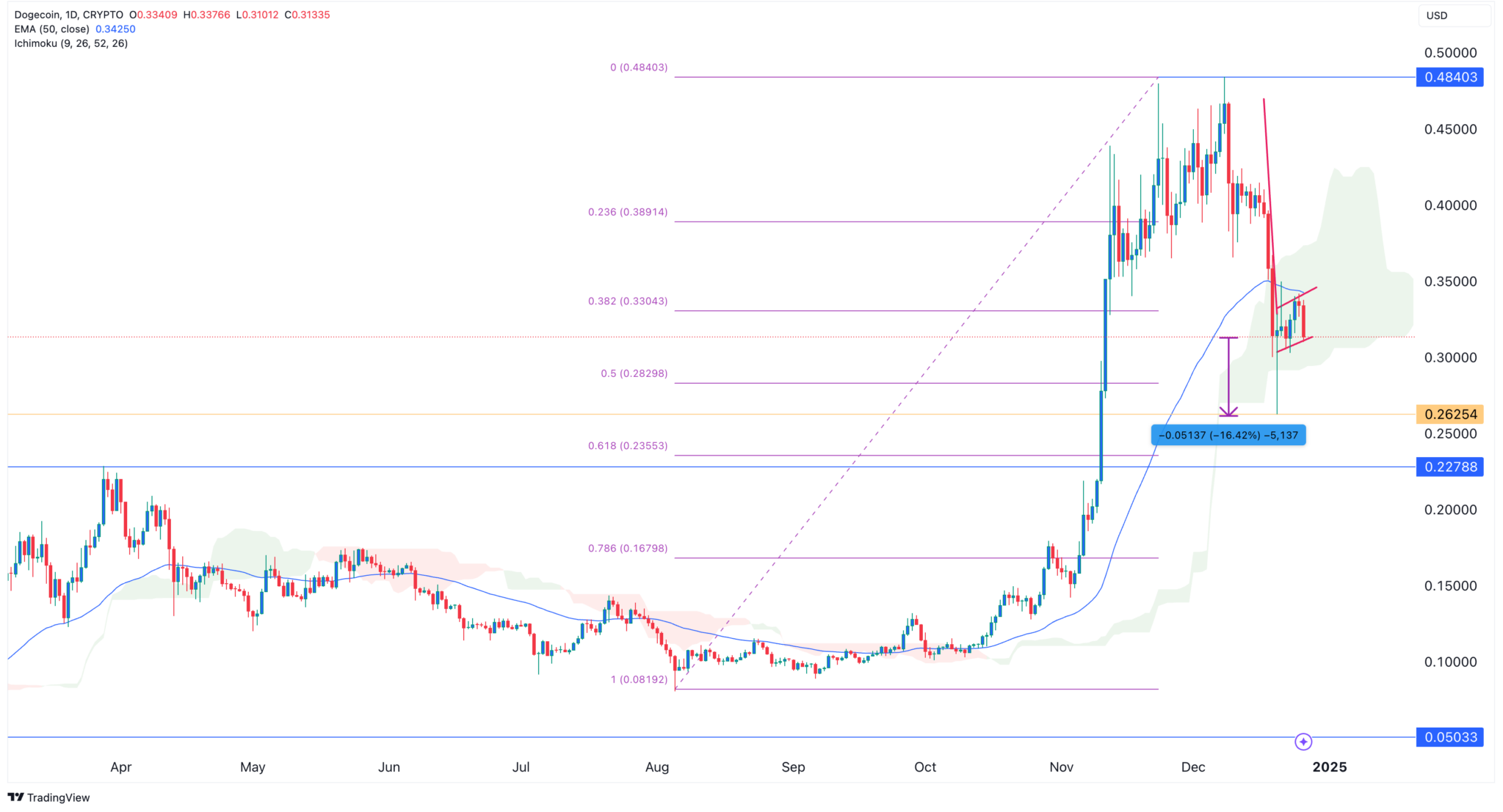 Der DOGE Kurs ist von einem Hoch bei 0,4840 US-Dollar Anfang dieses Monats auf derzeit 0,31 US-Dollar abgestürzt. Er liegt unter der 50 EMA Linie und versucht, die Ichimoku-Wolke zu verlassen.