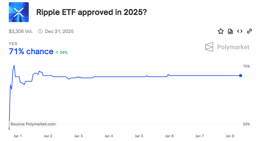 Die wachsende Vorfreude auf eine XRP-ETF-Zulassung wurde deutlich, da Daten von Polymarket eine 71%ige Chance auf eine XRP-ETF-Zulassung im Jahr 2025 zeigen.