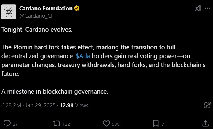 Die Cardano-Blockchain wird sich diesen Mittwochabend, den 29. Januar, weiterentwickeln. Laut dem neuesten Beitrag der Cardano Foundation auf X wird das Netzwerk endlich auf eine vollständig dezentralisierte Governance umgestellt.