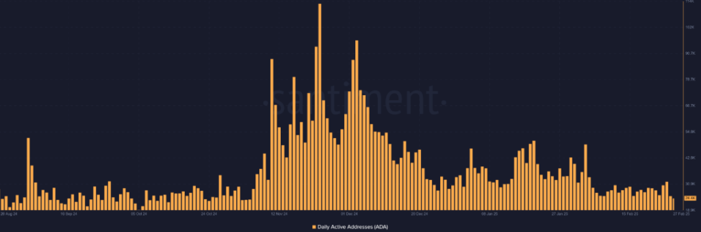 Darüber hinaus unterstreicht der negative MVRV die bärische Stimmung, da weniger Akteure nach Chancen bei den aktuellen Kursniveaus von ADA suchen.