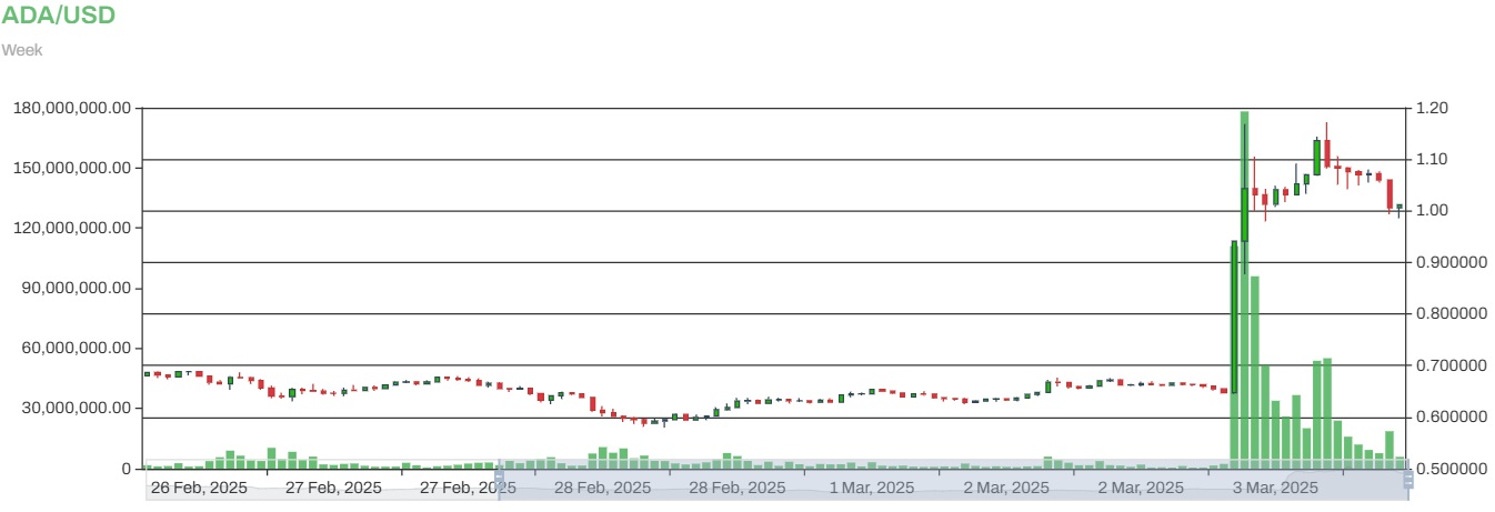 Trumps überraschende Bestätigung, dass Cardano Teil der von seinem Regime vorgeschlagenen Krypto-Reserve sein soll, rückte den Token kürzlich ins Rampenlicht und ermöglichte es ihm, sich an der 1-Dollar-Marke zu festigen. Er stieg von einem Tiefststand von 0,64 $ eine Stunde vor der Ankündigung des Präsidenten auf einen Höchststand von 1,13 $ eine Stunde nach dem Ereignis.