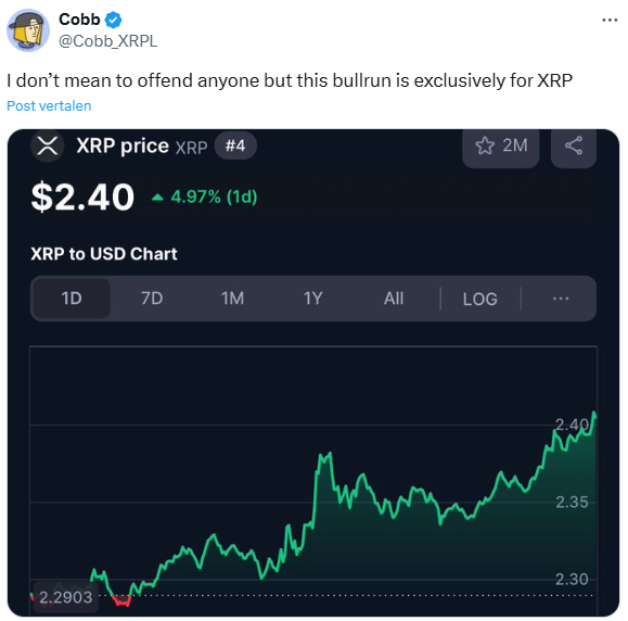 Der bekannte Krypto-Influencer Cobb (@Cobb_XRPL) hat auf X (früher Twitter) eine heftige Diskussion ausgelöst, indem er erklärte, dass die aktuelle Bullrun auf dem Kryptomarkt hauptsächlich XRP zugutekommt. Seine Aussage führte zu einer starken Reaktion aus der Community, wobei einige Investoren seine Einschätzung der Resilienz von XRP unterstützten, während andere kritisch darauf reagierten.