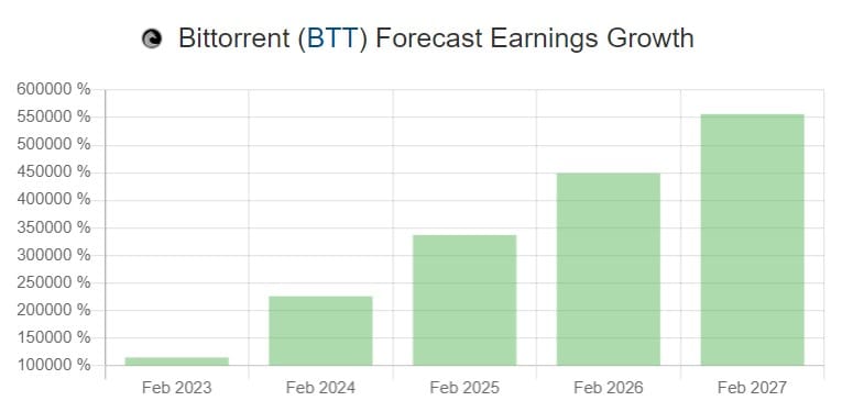 Die Aussichten für den weiteren Kurs von Bit Torrent scheinen extrem bullisch zu sein. Zumindest laut der Prognose von Wallet Investor, die dem Token eine extreme Wertsteigerung von fast 560.000 Prozent in den nächsten 5 Jahren zutraut. Sollte dieses Wachstum tatsächlich wahr werden, würde der Kurs auf mehr als 0,012 Dollar steigen. Damit würden Anleger aus einer kleinen Investition von 200 Euro zum aktuellen Zeitpunkt bis 2027 eine Summe von mehr als einer Million Euro machen.