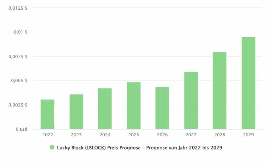 Und die Prognose für die neue Kryptowährung ist sehr bullisch. So erwartet Digital Coin Price, dass der Kurs in den nächsten Jahren kontinuierlich steigen wird und LBLOCK sich tatsächlich der Marke von 1 Cent annähern kann. Das wäre gegenüber dem aktuellen Preis einer Steigerung um 4X bis 5X. Trifft die Prognose zu, ließen sich aus einem Investment von 1.000 Dollar in den Lucky Block Token in wenigen Jahren 4.000 oder 5.000 Dollar machen. Eine starke Rendite, die etwa beim Kauf von Aktien deutlich seltener zu erzielen ist.
