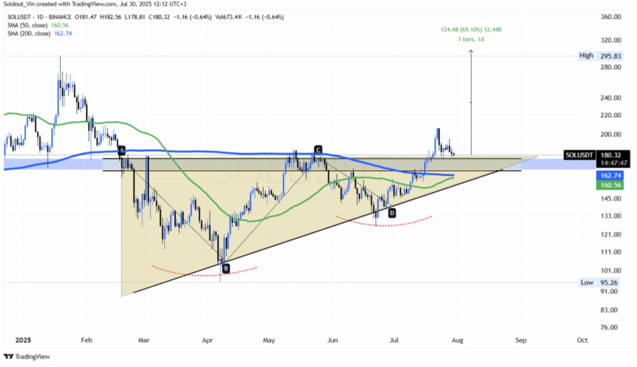 Der Solana-Preis hat sich seit dem Erreichen von Höchstständen nahe 206 $ seitwärts bewegt. Versuche, weiter nach oben zu klettern, stießen auf Widerstand und konnten den Aufwärtstrend nicht fortsetzen. Der SOL-Preis liegt derzeit bei etwa 183,92 $ und damit über seinen wichtigen 50-Tage- und 200-Tage-Durchschnittswerten von 160,30 $ und 162,79 $.