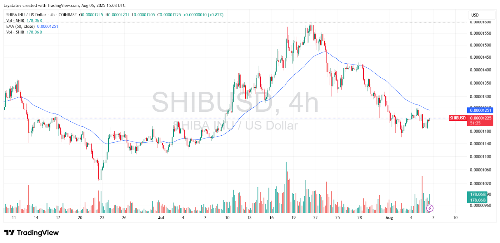 Trotz der Bedeutung dieser Governance-Überarbeitung hat der Markt mit einem gedämpften Achselzucken reagiert. Zum Zeitpunkt der Analyse dieses Berichts wurde SHIB auf dem 4-Stunden-Chart in der Nähe von 0,00001225 $ gehandelt und hielt sich damit über seinem jüngsten Tief von 0,00001180 $, aber unter dem exponentiellen gleitenden 50-Perioden-Durchschnitt (EMA) bei 0,00001251 $.