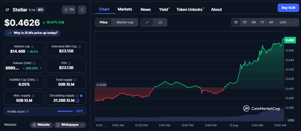 XLM ist von 0,36 $ am 2. August auf das heutige Intraday-Hoch über 0,46 $ gestiegen.