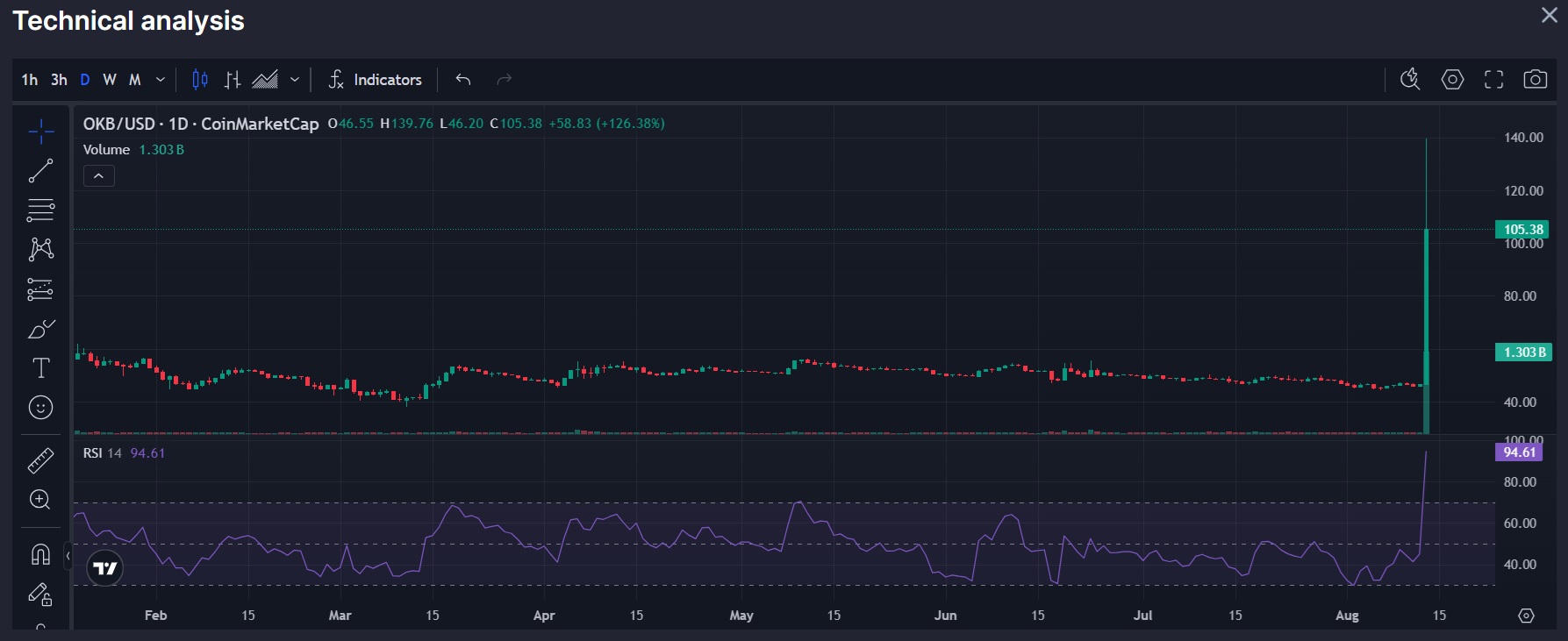 OKB, ein Token, der mit der OK Blockchain Foundation und der Handelsplattform OKX verbunden ist, stieg in den letzten 24 Stunden um rund 200 % von einem Tiefststand von 46,58 $ auf einen Höchststand von 139,76 $. Damit übertraf er den bisherigen Höchststand der Kryptowährung von 73,82 $ im März 2024 um 89 %.