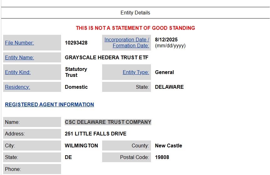 Das Produkt heißt „Grayscale Hedera Trust ETF” und ist unter der CSC Delaware Trust Company registriert. Dieser Schritt geht oft einer S-1-Einreichung bei der Securities and Exchange Commission (SEC) voraus.