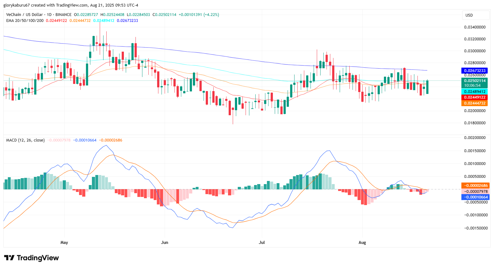 Die technischen Indikatoren deuten darauf hin, dass VeChain die Unterstützung bei $0,022-$0,023 testet. Widerstand ist bei $0,026 zu erkennen, mit Erholungspotenzial, falls die Unterstützung hält. Der MACD zeigt ein leicht rückläufiges Momentum. Analysten sind der Meinung, dass ein Umkippen des 200-Tage-EMA von Widerstand auf Unterstützung einen Wechsel zu einem Aufwärtstrend signalisieren könnte.
