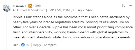 Die Diskussion schloss allmählich den Kreis zurück zu Ripple, wo der Blockchain-Experte Osama E. feststellte, dass XRP fast ein halbes Jahrzehnt lang regulatorischen Herausforderungen standgehalten hat und dennoch weltweit tätig ist.