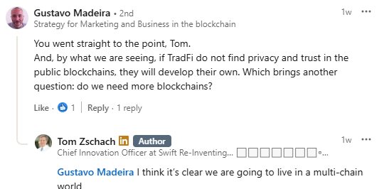 Andere Experten wie Gustavo Madeira wiesen darauf hin, dass das traditionelle Finanzwesen sich dafür entscheiden könnte, eigenständig Lösungen zu entwickeln, wenn öffentliche Blockchains nicht in der Lage sind, sie zu berücksichtigen.
